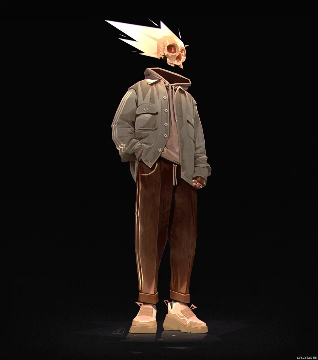 skull head with flames coming from its mouth and ears, suggesting they have some kind of power or ability related to fire. The rest of the character is human-like in appearance but features a jacket over a t-shirt and brown pants, which are