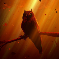 a fantastical scene featuring an owl perched on a branch in what appears to be a dense forest or jungle setting. The environment is enveloped in misty, warm lighting that gives the scene an almost