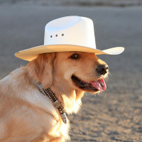 a cowboy hat on its head, giving it a playful and anthropomorphic appearance as if the dog were humanizing itself by dressing up in Western attire. This scene might suggest