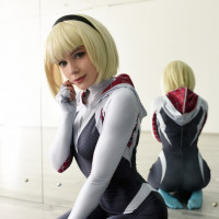 Gwen Stacy from comic books or animated series. The costume includes elements that are characteristic of her character, such as the color scheme and design elements from Spider-Man's universe. The individual is posing with their hands placed near the face, which adds a playful and expressive element to the shot.
