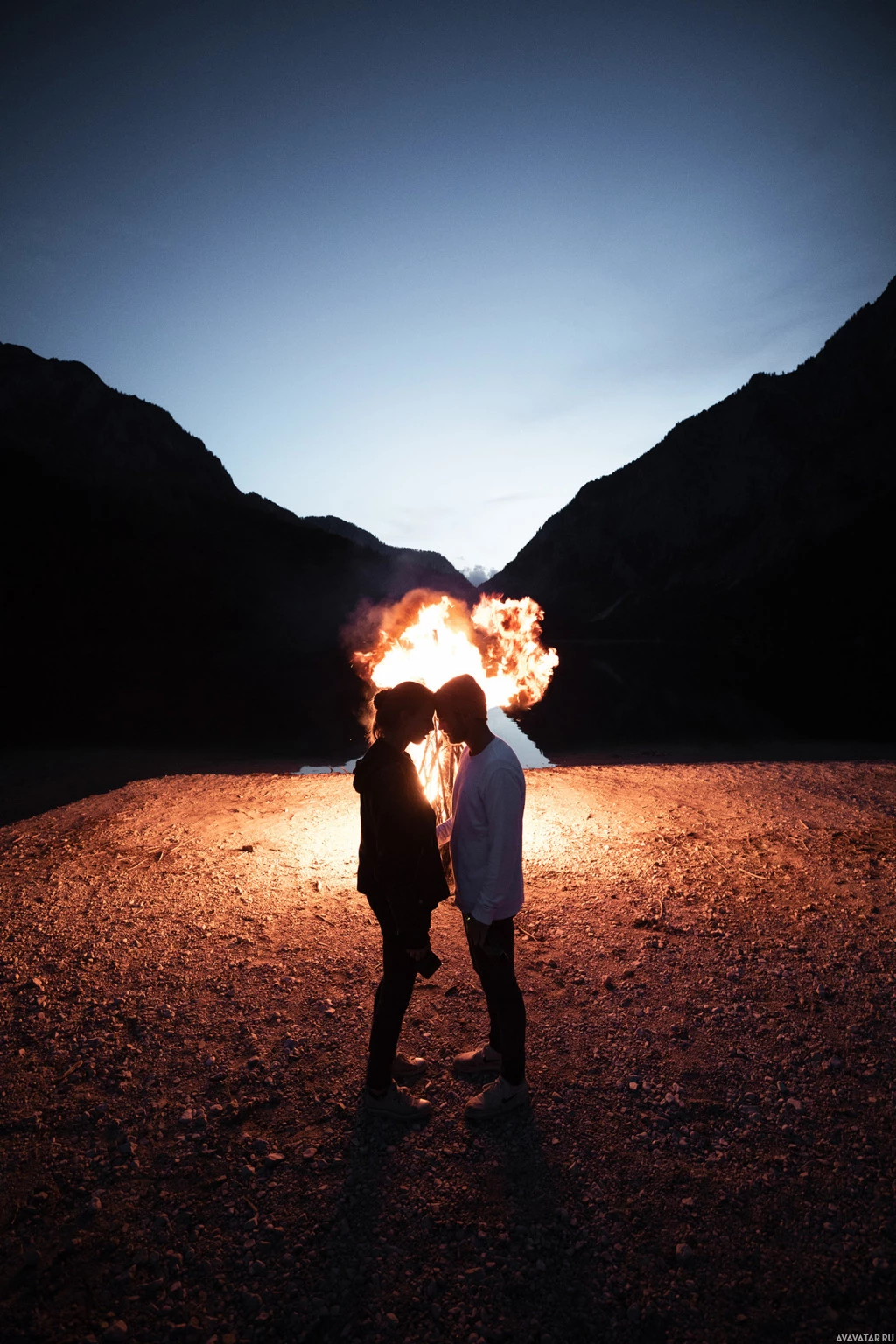 The image shows two individuals standing close to each other outdoors, with a fire and flames nearby. They appear to be engaging in