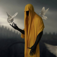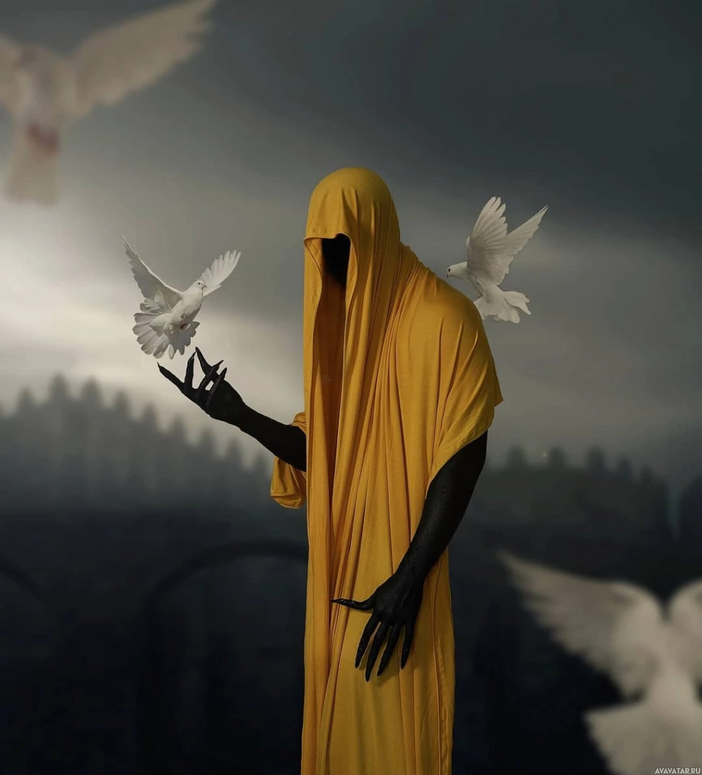 The image depicts a figure dressed in yellow, reminiscent of a ghostly or supernatural appearance. The figure is holding out their hands towards three doves flying around them. The background suggests a bleak and possibly ancient or medieval setting, with arches and ruins that hint at