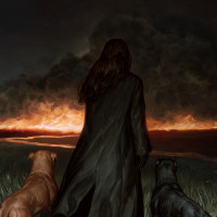 The image depicts a dramatic scene with two figures, one sitting and the other standing. They appear to be observing an intense situation unfolding in the background. There is a fire or explosion that is occurring near a body of water, which could be a lake or river. A dog is also present in the scene, adding a sense of companionship or perhaps even loyalty. The overall atmosphere suggests tension and concern for the situation at hand.