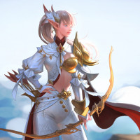 an outdoor setting with natural elements like clouds and vegetation. Her attire and the archery equipment suggest she may be involved in combat or adventure within her