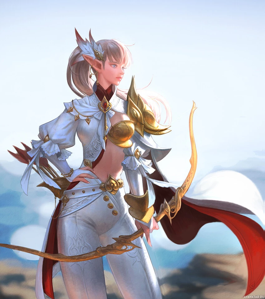 long hair and pointed ears, wearing armor and holding a bow. She is standing against a backdrop that suggests she might be in