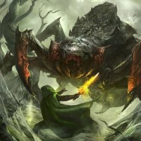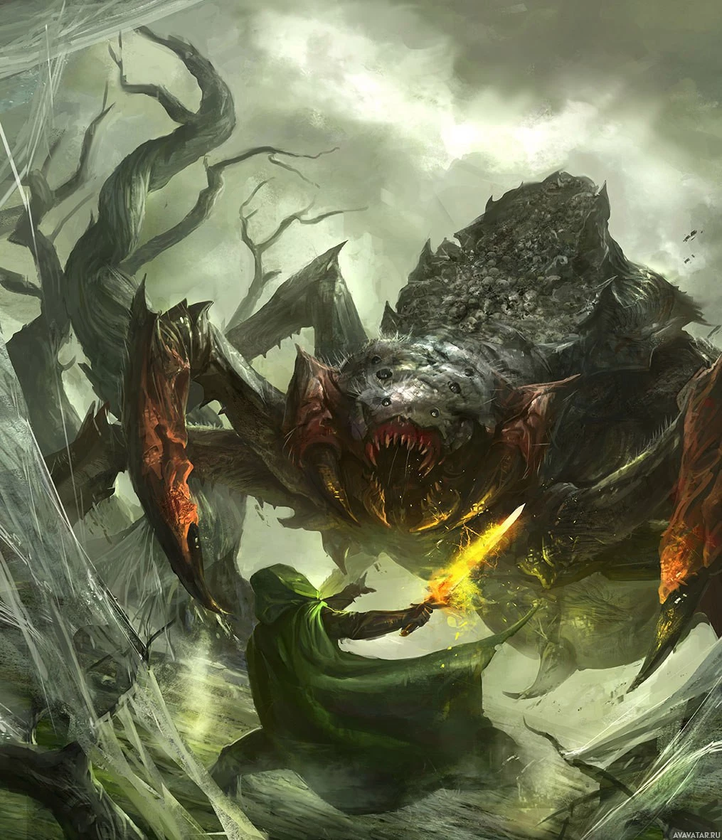a fantasy scene featuring a warrior and a spider. The warrior, dressed in armor and holding a sword, is confronting