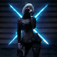 a futuristic setting with neon lights and a metallic look, possibly indicative of a sci-fi or cyberpunk theme. The character's expression and body language convey