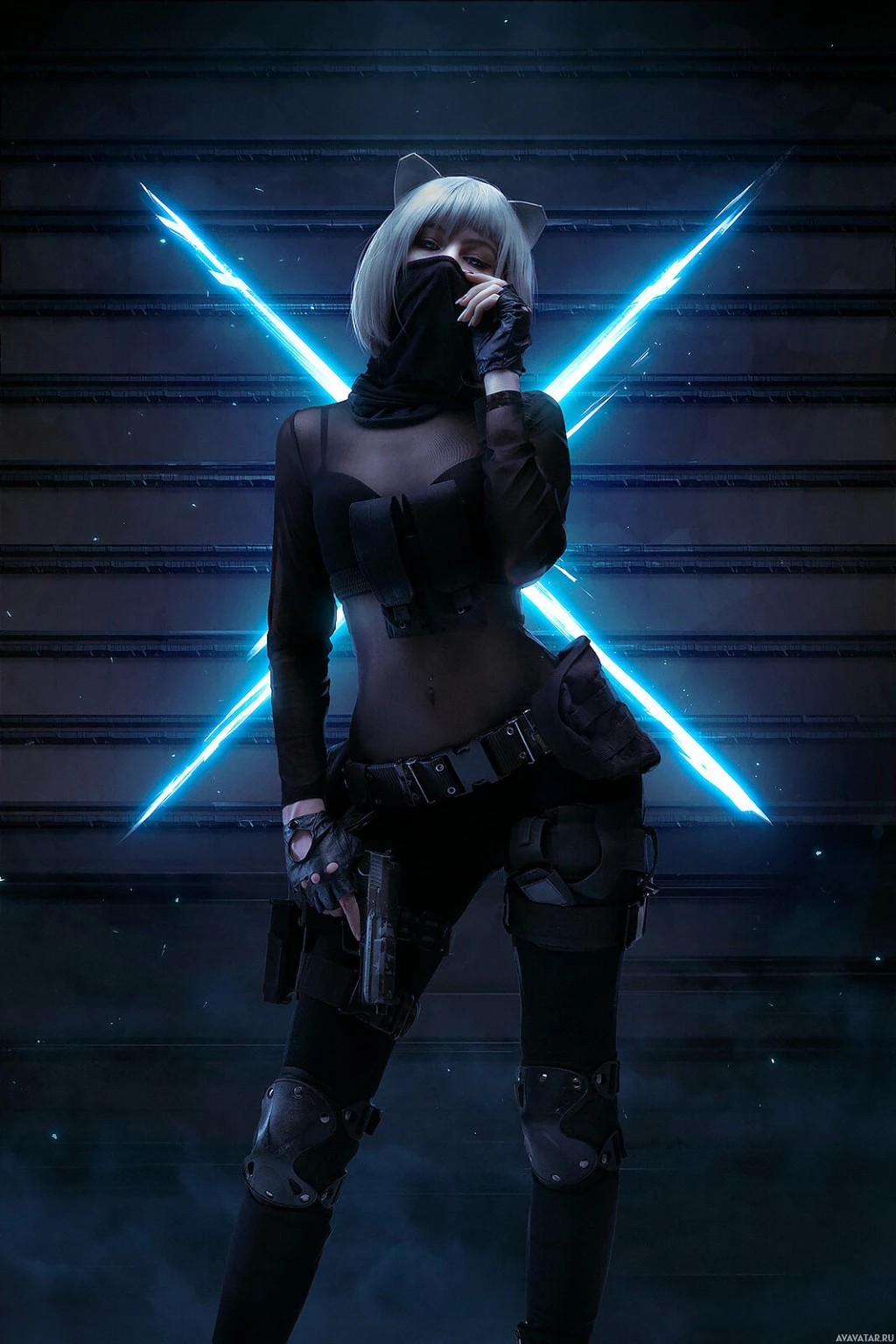 blonde hair with some darker roots showing through. Her pose is confident and striking, with one hand on her hip while the other holds what looks like a pistol pointed upwards. The background suggests
