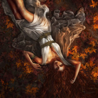 classical attire, possibly evoking the style of ancient Greek or Roman gods and goddesses. Her pose is relaxed, and she looks upward towards her head, giving