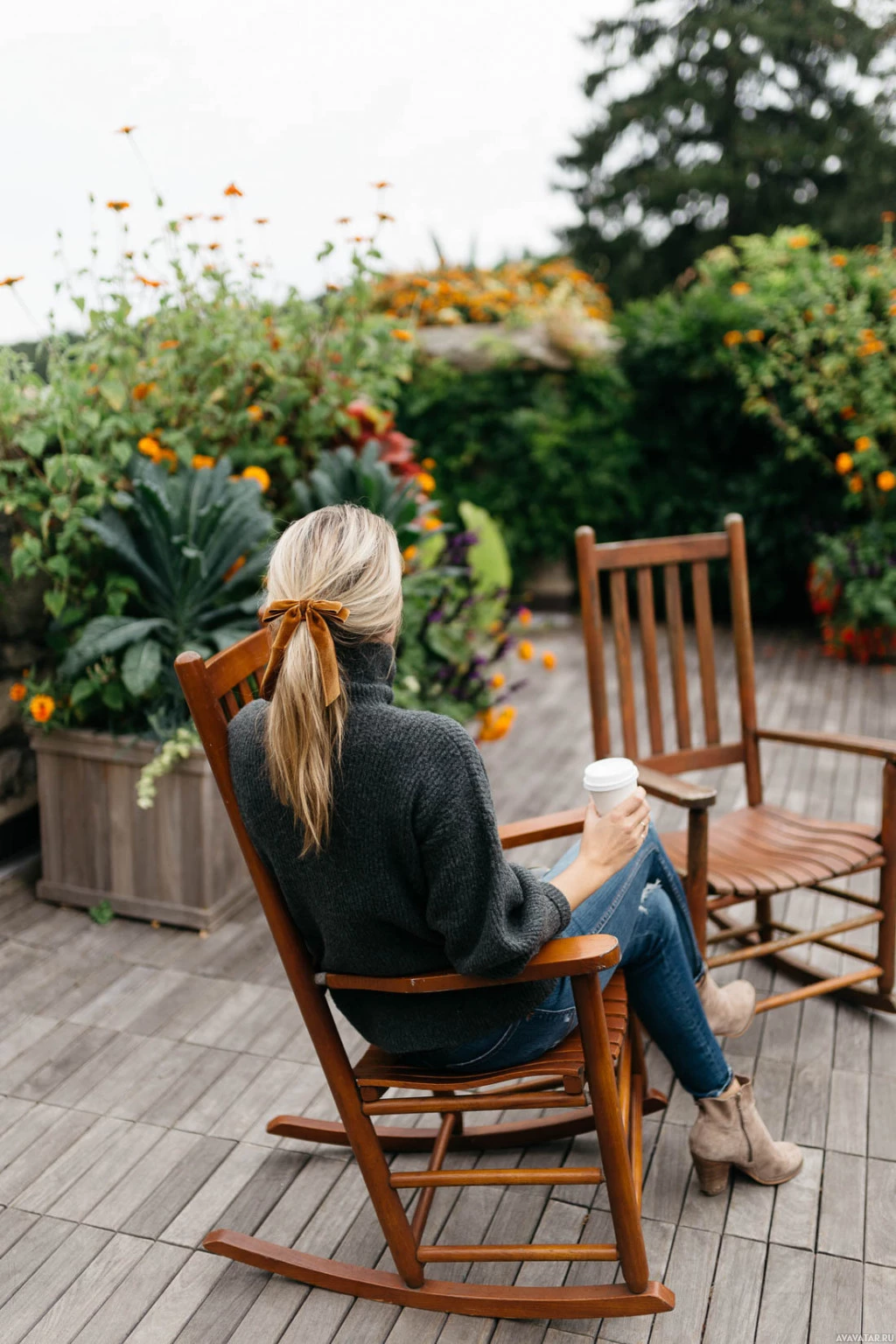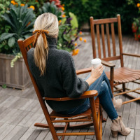 The image shows a woman sitting on a wooden rocking chair. She has