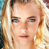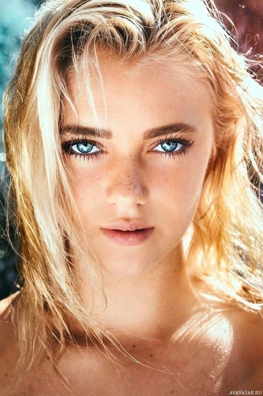 blue eyes and is looking directly at the camera. The background appears to be out of focus, emphasizing her facial features. Her hair seems to be gently blowing in the breeze, adding a dynamic element to the photograph.