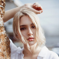 The picture shows a woman posing with her hand resting on a brick wall. She has blonde hair, is wearing a white top or shirt, and appears to be looking off to the side with a slight smile. It seems like she's enjoying a casual moment, possibly in an urban setting.