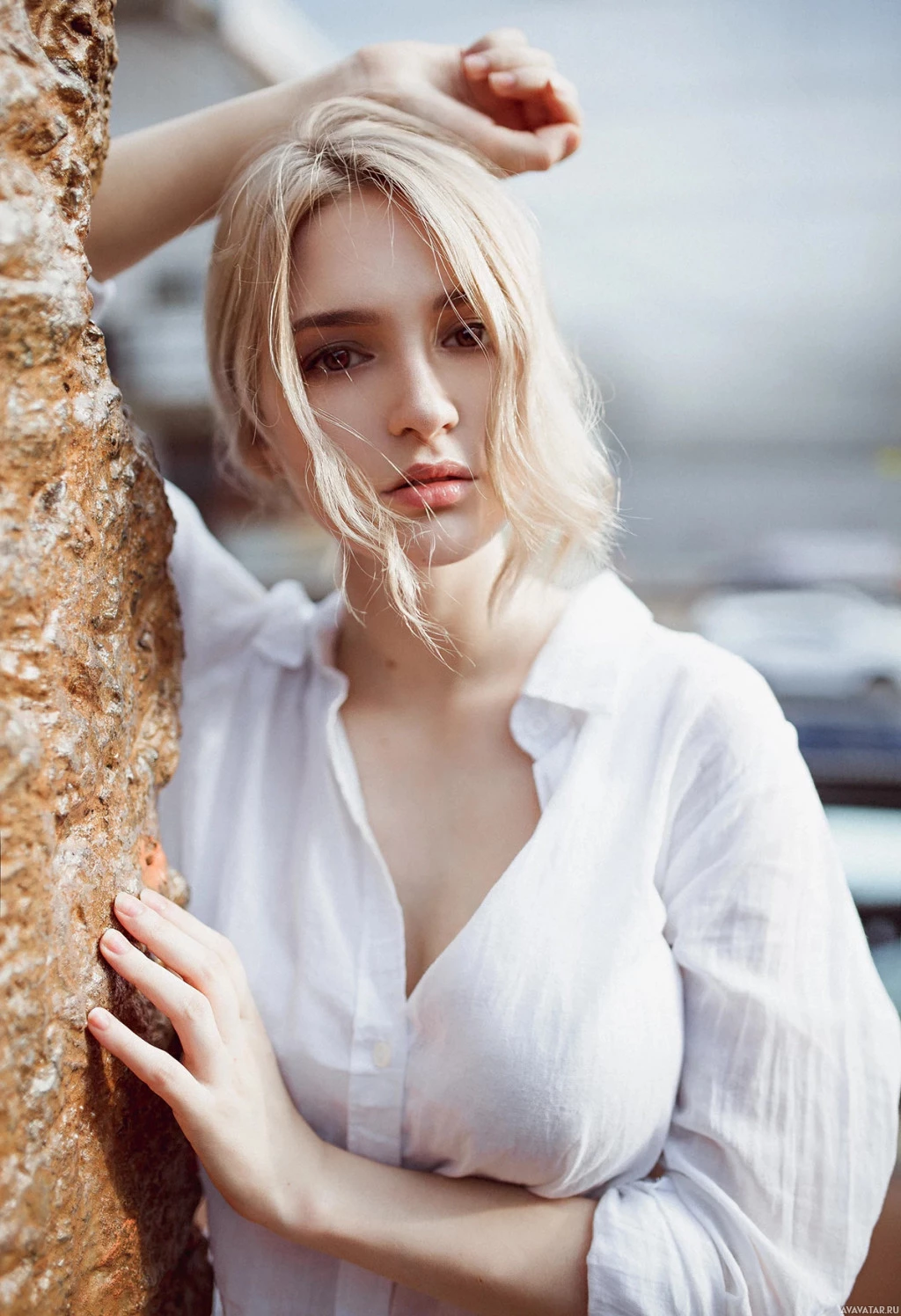 На картине изображена женщина, позирующая с рукой, покоящейся на кирпичной стене. У нее светлые волосы, она носит белую верхнюю или рубашку и, кажется, смотрит в сторону с легкой улыбкой. Кажется, она наслаждается случайным моментом, возможно, в городской обстановке.