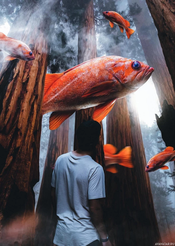 several fish, predominantly red and yellow in color, which appear to be swimming as if they were in water. The scene is likely digitally manipulated or composed to create an artistic or surreal effect, as it's unusual to see fish floating in