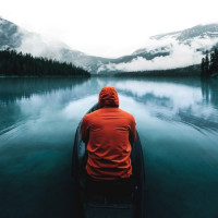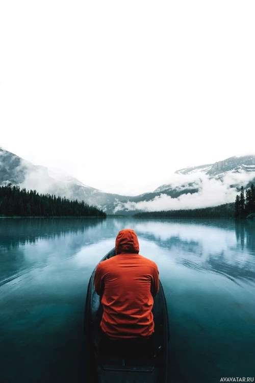 a hooded jacket and appears to be looking out over the water, suggesting they might be contemplating something or simply enjoying the view. Behind them, there are mountains covered with mist or low-