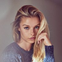 blonde hair, posing in a candid manner. She appears to be looking directly at the camera or the viewer, and her hand is resting on her chin, which suggests a thoughtful or contemplative pose. Her expression is neutral, and she has a soft,
