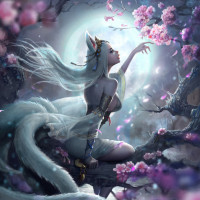 a full moon, adding to the mystical atmosphere of the scene. The setting seems to be a fantasy or otherworldly environment, possibly inspired by themes found in