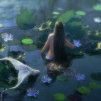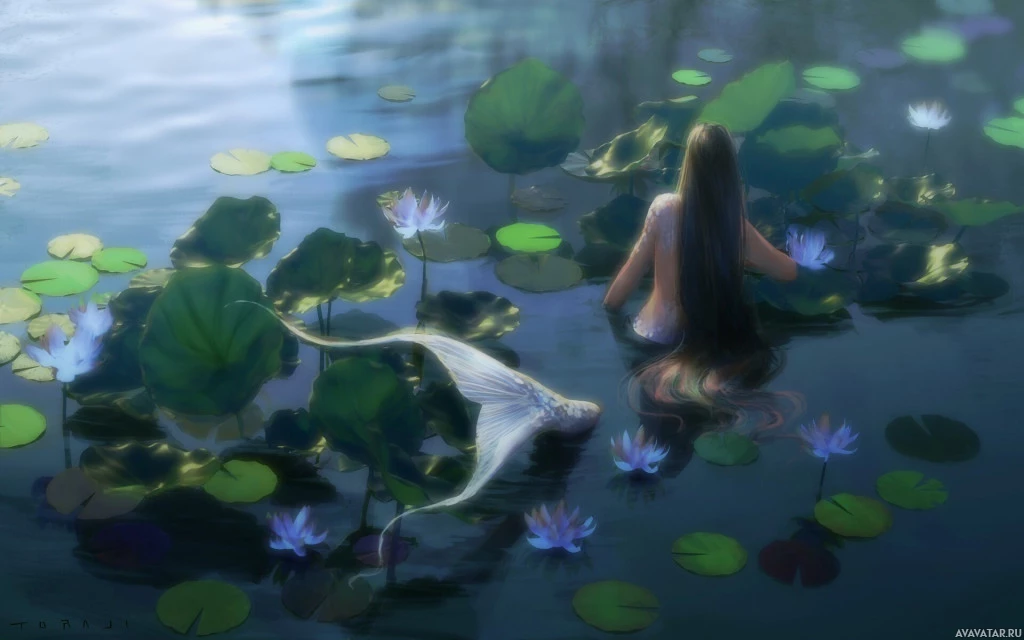 In this image, there is a character who appears to be a mermaid from behind. She has long hair and is sitting on what seems to be lotus flowers in water, with the surrounding environment depicted as a serene landscape possibly inspired by