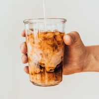 an iced coffee or cold brew. The drink appears to have cream and ice in it, as suggested by the visible layers within the glass. The background is neutral, focusing the attention on the act of holding the drink.