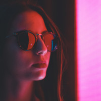 The image shows a woman with sunglasses on, looking off to the side. She has long hair and appears to be in an indoor setting, possibly at night given the ambiance of red and purple lights that resemble neon signs.