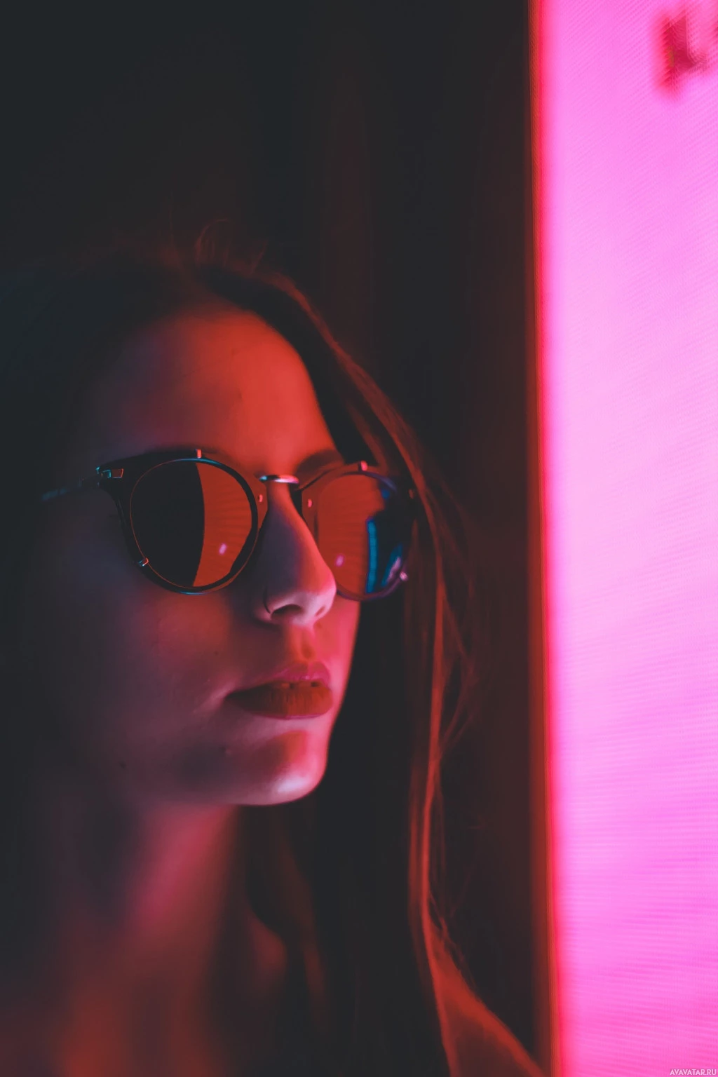 На картинке изображена женщина в солнечных очках, которая смотрит в сторону. Она имеет длинные волосы и, кажется, находится в помещении, возможно, ночью, учитывая атмосферу красных и фиолетовых огней, которые напоминают неоновые знаки.