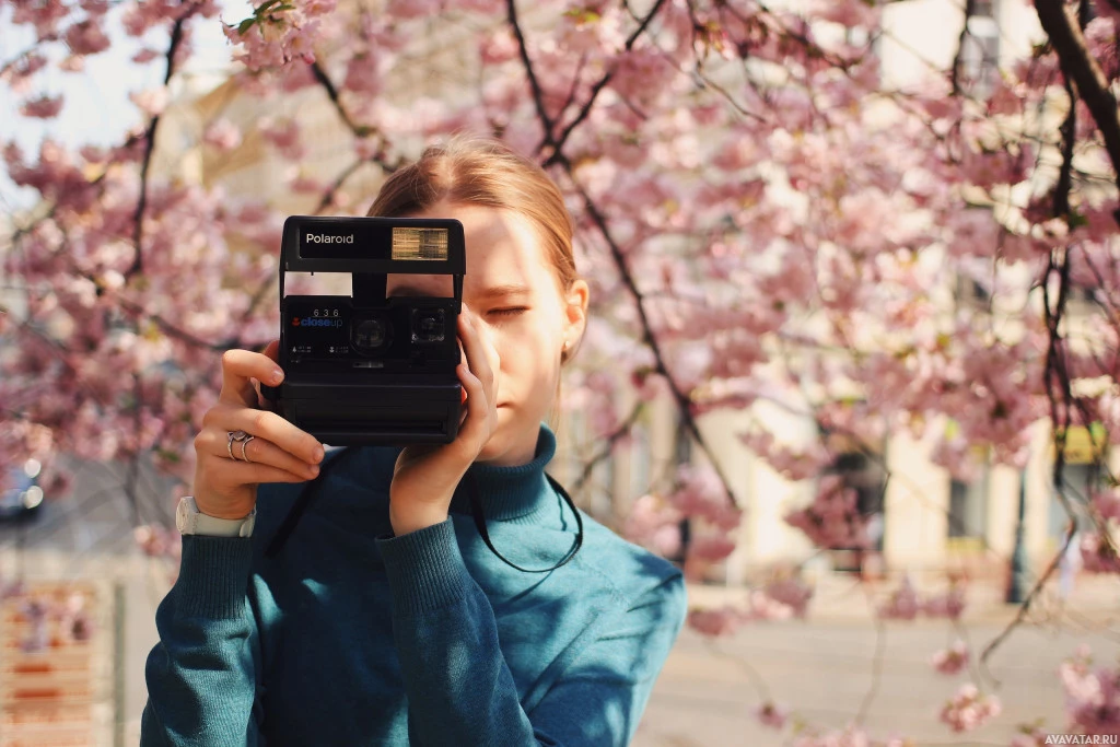 instant camera. The individual is standing under flowering trees, which suggests that it might be spring or