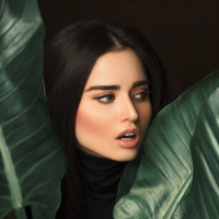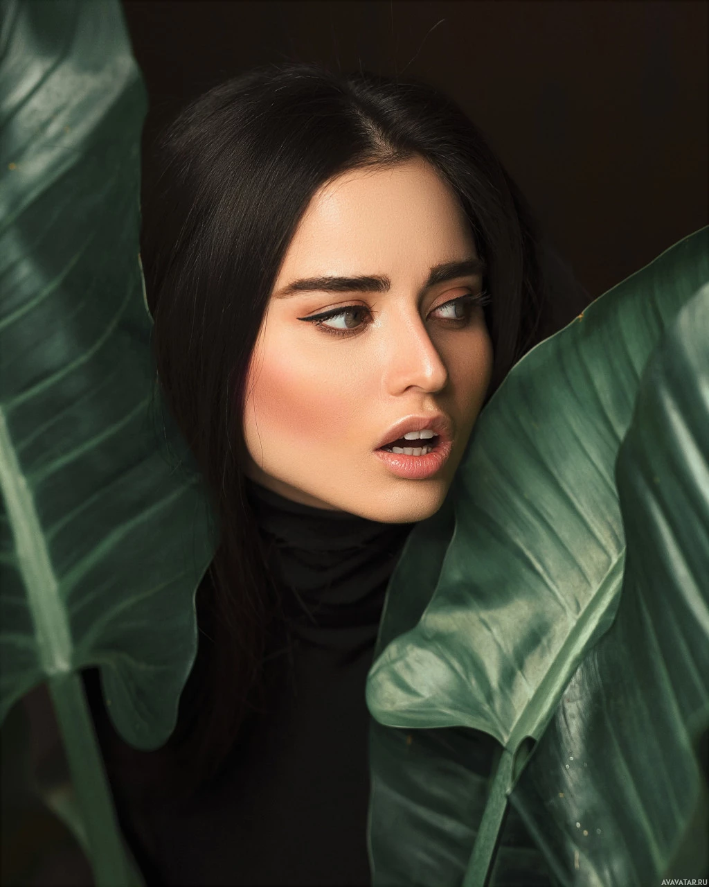 brown hair and makeup. She appears to be looking at something outside the frame, and her mouth is slightly open. She's wearing what seems to be