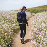 a sunny day with clear skies. The person is likely hiking or trekking through