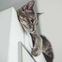 The image shows a cat leaning against a white surface, possibly a rail or ledge. The cat appears to be looking at something with interest, as indicated by its alert posture and open eyes. Its fur is striped in various shades of grey.