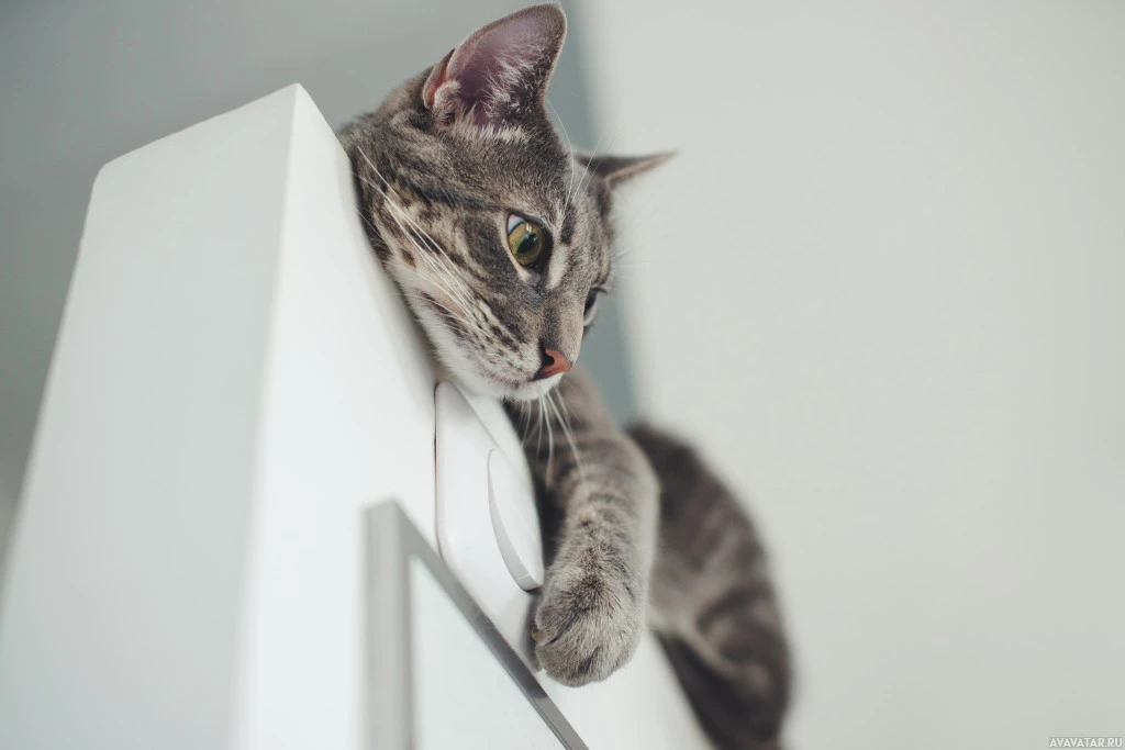 На картинке изображен кот, прислоненный к белой поверхности, возможно, к рельсу или выступу. Кошка, кажется, смотрит на что-то с интересом, о чем свидетельствует ее настороженность и открытые глаза. Его мех полосат в различных оттенках серого.