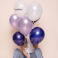 The image shows a person sitting on the floor with a bunch of balloons around them. The balloons are predominantly purple and blue in color, and there is text printed on some of the balloons that says "CARDIOLOGY." The person appears to be wearing