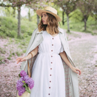 a pleasant day. The woman wears a hat that matches the color of her dress, and she seems to be looking off into the distance with