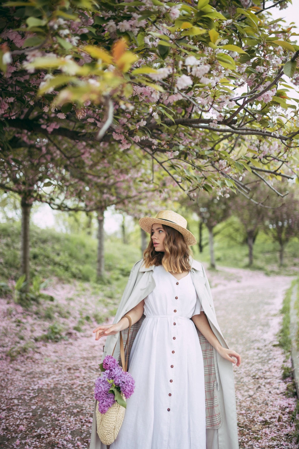 cherry blossoms blooming. She is dressed in a light-colored, long-sleeved dress and holds a parasol, which suggests she might be enjoying a leisurely outing on