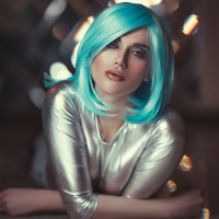 turquoise hair. She has her head tilted slightly to one side and her hands are placed on a surface that could be a countertop or table. The lighting in the photo appears to have a bokeh effect, which adds