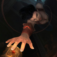 dark hair and is wearing what looks like elven armor or clothing. The character has a hand reaching towards something below her, possibly