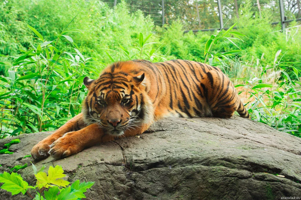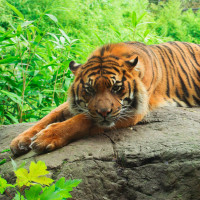 На картине изображен большой тигр, лежащий на скале в пышной зеленой лесной местности. Тигр смотрит прямо в камеру, демонстрируя бдительность и сфокусированное поведение.