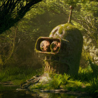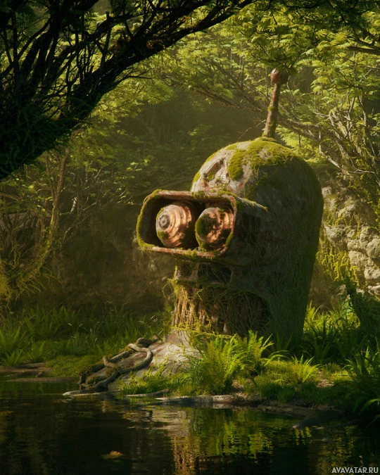 a natural environment, surrounded by foliage that suggests he might be in the forest or wilderness, which contrasts with his typical setting on the spaceship Planet Express.