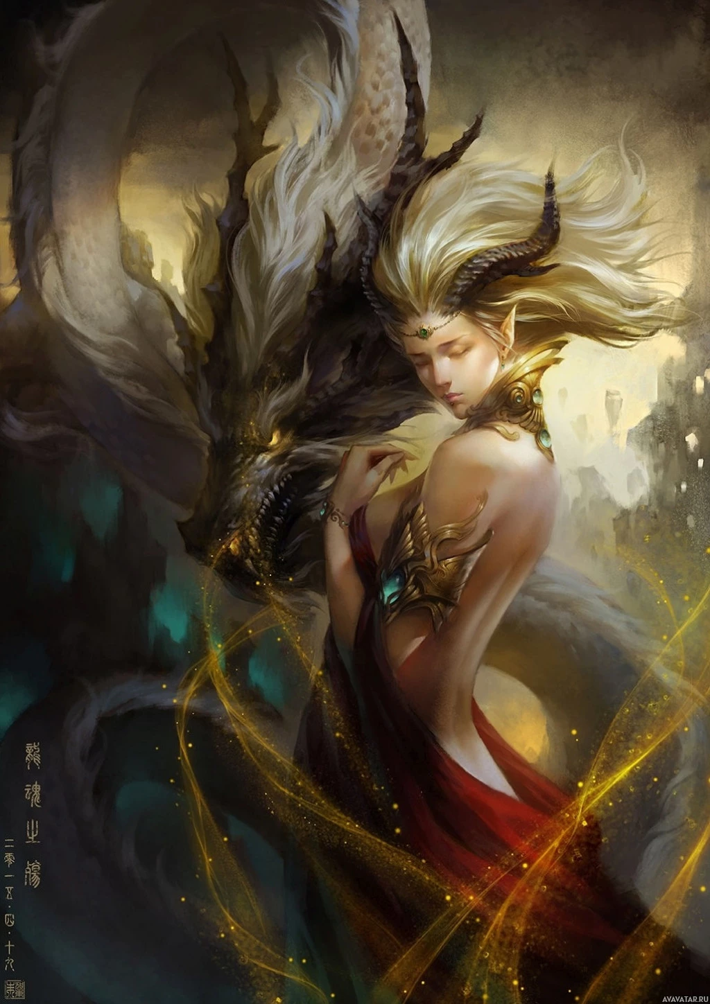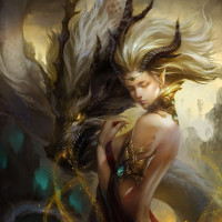 the tail of a dragon, which is also depicted with intricate details and is coiled around her. The background features a cityscape with a glowing sky, adding to