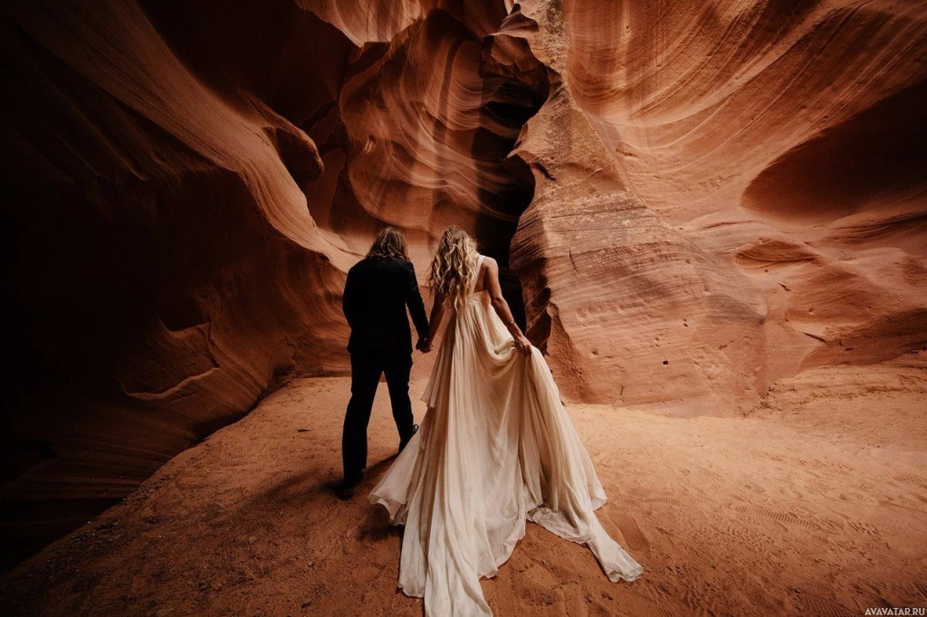 Antelope Canyon, Arizona. From behind, the bride is wearing an elaborate
