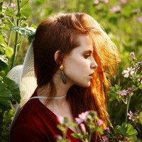 The image features a young woman with vibrant red hair, set against the backdrop of a lush green field with wildflowers. She is wearing what appears to be a white hat or headpiece and has a delicate necklace around her neck. Her expression is contemplative as she gazes into the distance, perhaps lost in thought or appreciating the beauty of nature around her.