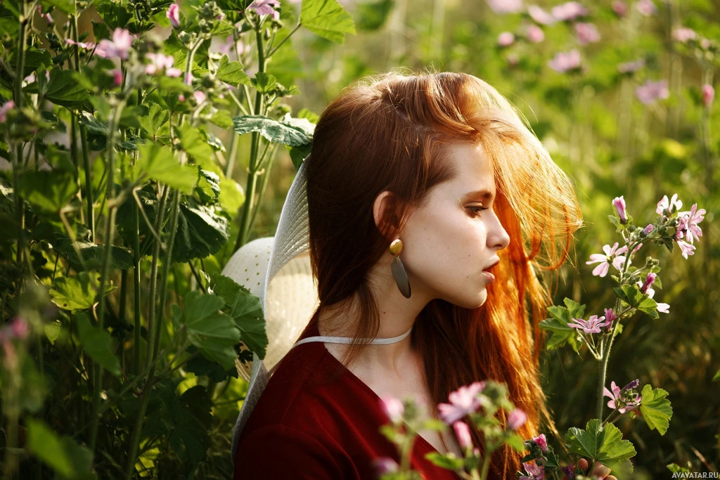 На картинке изображена молодая женщина с яркими рыжими волосами, расположенная на фоне пышного зеленого поля с полевыми цветами. Она носит то, что кажется белой шляпой или головным убором и имеет нежное ожерелье на шее. Ее выражение созерцательно, когда она смотрит вдаль, возможно, потерявшись в мыслях или ценя красоту природы вокруг нее.