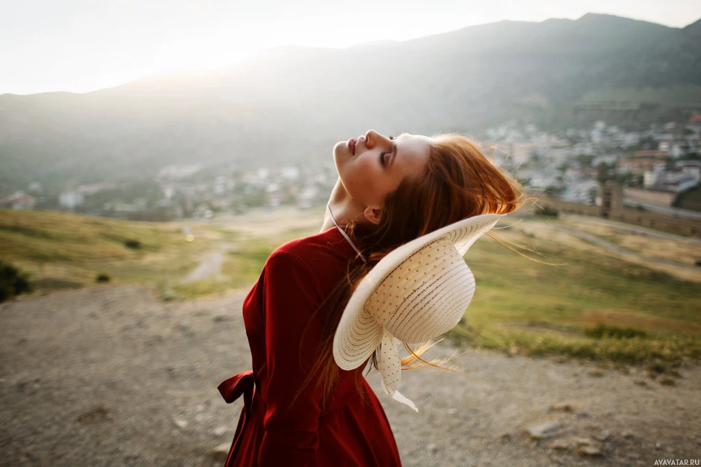 На снимке изображен человек сзади, смотрящий на камеру с закрытыми глазами. Они имеют длинные рыжие волосы и носят соломенную шляпу. Фон кажется живописным открытым местом с горами на расстоянии под закатным небом.