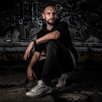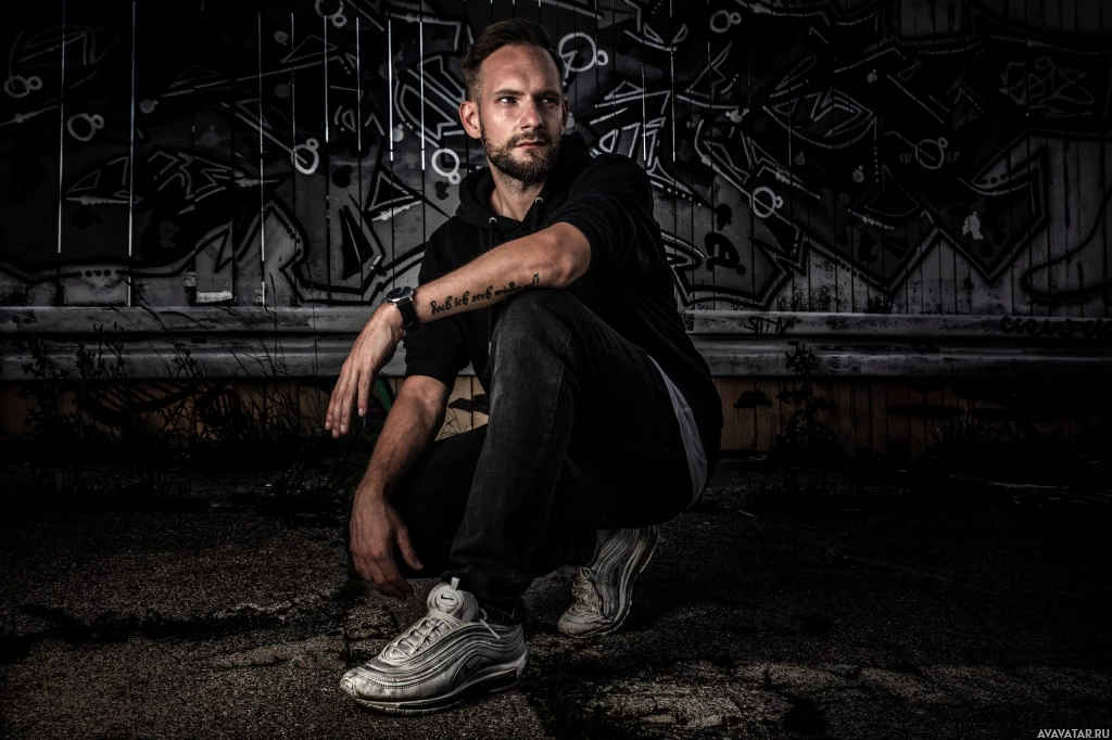 The image shows a man sitting on what appears to be an urban street setting, possibly against the backdrop of graffiti or some other form of