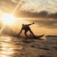 The image shows a person surfing on a wave during sunset. The silhouette of the surfer is visible against the warm,