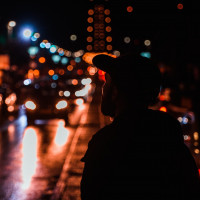На картинке изображен силуэт мужчины, стоящего на тротуаре ночью, с видимым на заднем плане движением. Вероятно, идет дождь из-за отражения фар и мокрой дорожной поверхности.