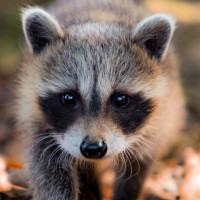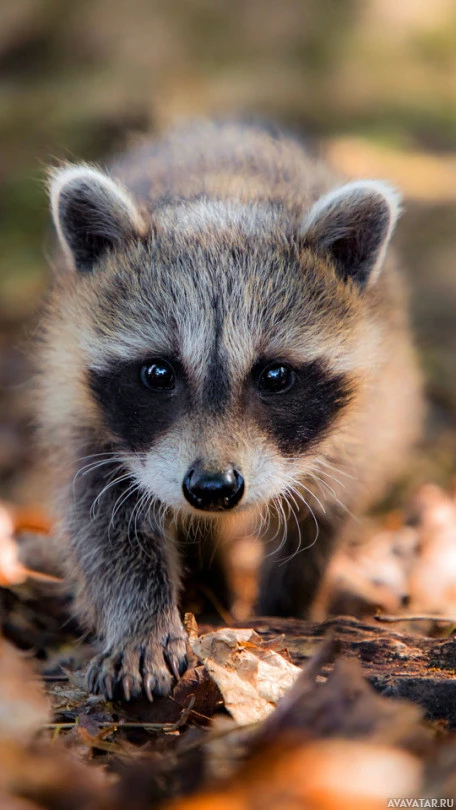 The image shows a young raccoon, also known as a baby red panda or a coon. It is walking on a forest floor with fallen leaves. The background suggests an outdoor environment that could be part of the raccoon's natural habitat.