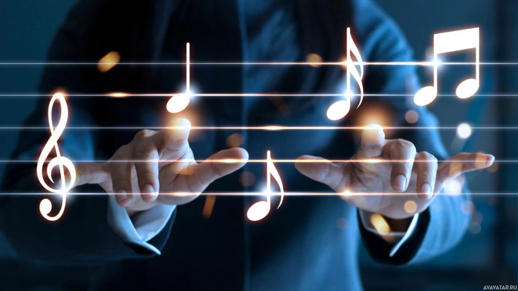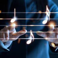 musical notes floating around them. The hands are positioned on