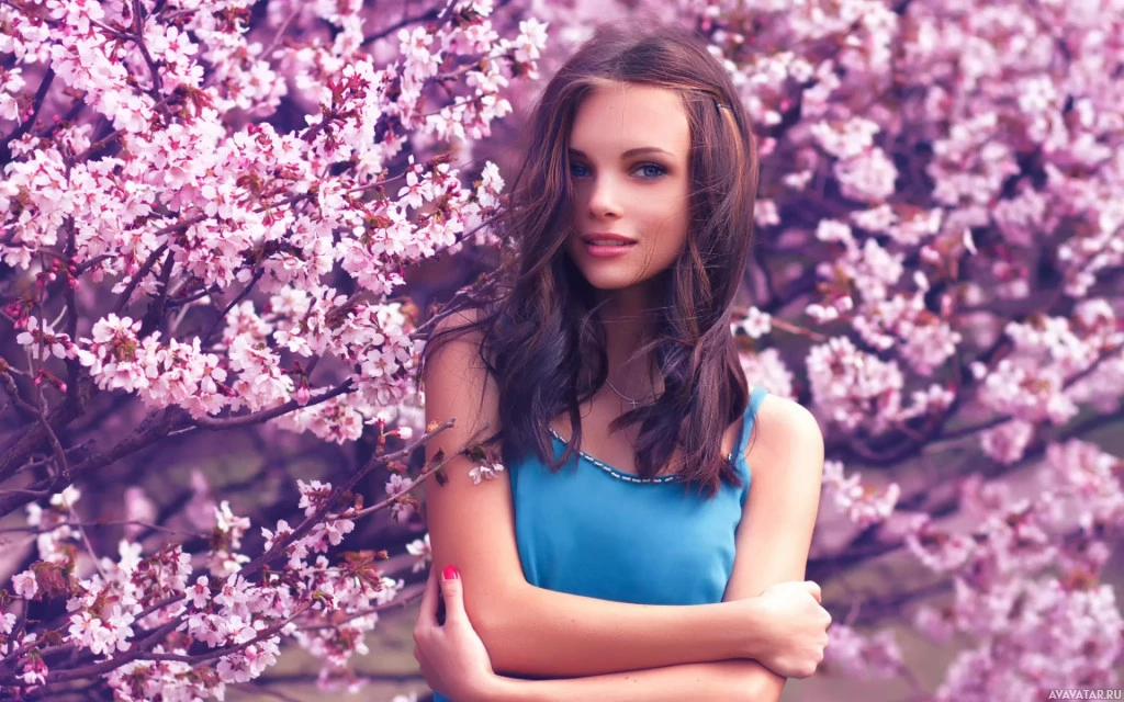На снимке изображена женщина, позирующая для камеры. Она улыбается и, кажется, находится перед деревом с цветами, которые могут быть цветами вишни, учитывая их ярко-розовый цвет. Фон предполагает парк или сад в течение весны.