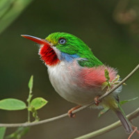 The image shows a colorful bird, commonly known as the keel-billed toucan or rainbow lorikeet. It is characterized by its vibrant red and blue plumage, with black markings on the head and wings, and an elongated orange beak. The bird appears to be perched on a branch in a natural setting.