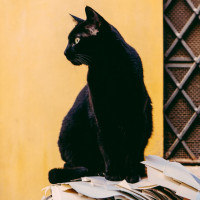 На картинке изображена черная кошка, сидящая поверх того, что кажется стопкой бумаг или документов. На заднем плане находится окно с решетками и частично видимой текстурированной тканью или материалом.